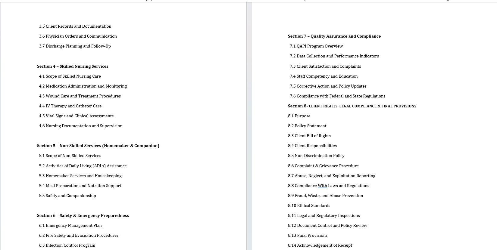 Our Florida Digital Home Care Policy and Procedures Manual takes the guesswork out of compliance. Instead of writing policies from scratch or hiring an expensive consultant, you’ll receive a complete, ready-to-use document customized for your agency.